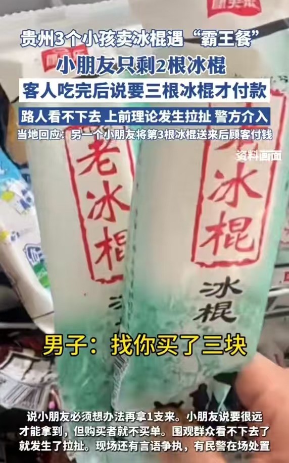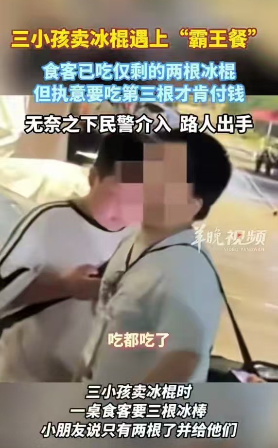 冰棍纠纷闹剧40分钟,警察全程在场却未强制花衬衫男付钱。全网聚焦执法者腰间的警徽:明明《治安管理处罚法》第26条写着“强拿硬要处拘留罚款”,为何变成和稀泥?更讽刺的是,事后通报轻描淡写“顾客已付款”——真相是老板娘(男子亲姑)偷偷垫钱!男人连句道歉都没有,嚼着冰棍渣走了。网友怒晒法条截图:“警察不执法,要调解员干嘛?”