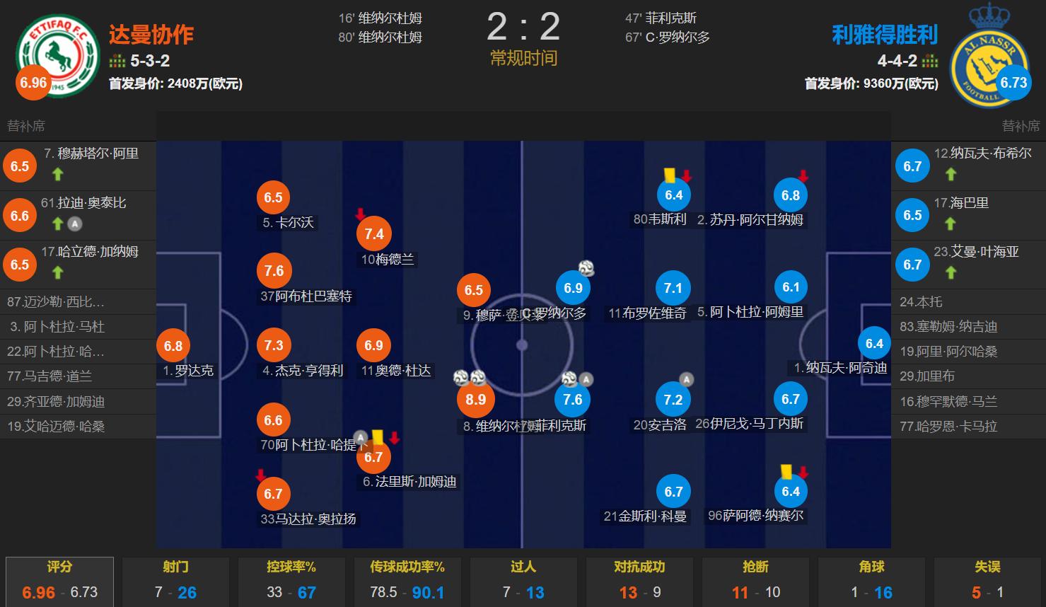 全场比赛,利雅得胜利的控球率为67%,一共有26次射门,其中7次射正;达曼协作一共有7次射门,其中4次射正。