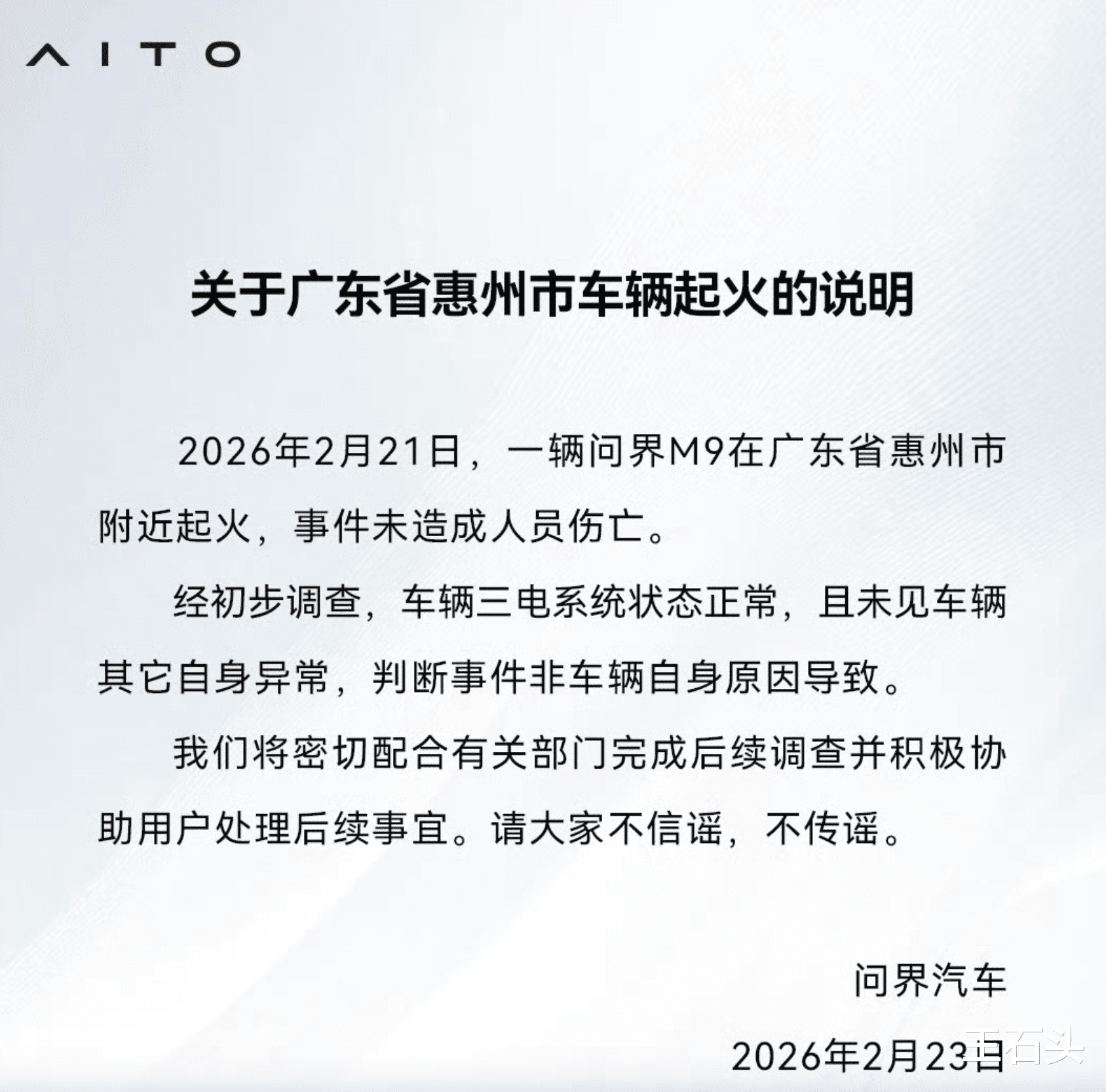 2月23日,问界汽车通过官方渠道发布了一则 《关于广东省惠州市车辆起火的说明》 。