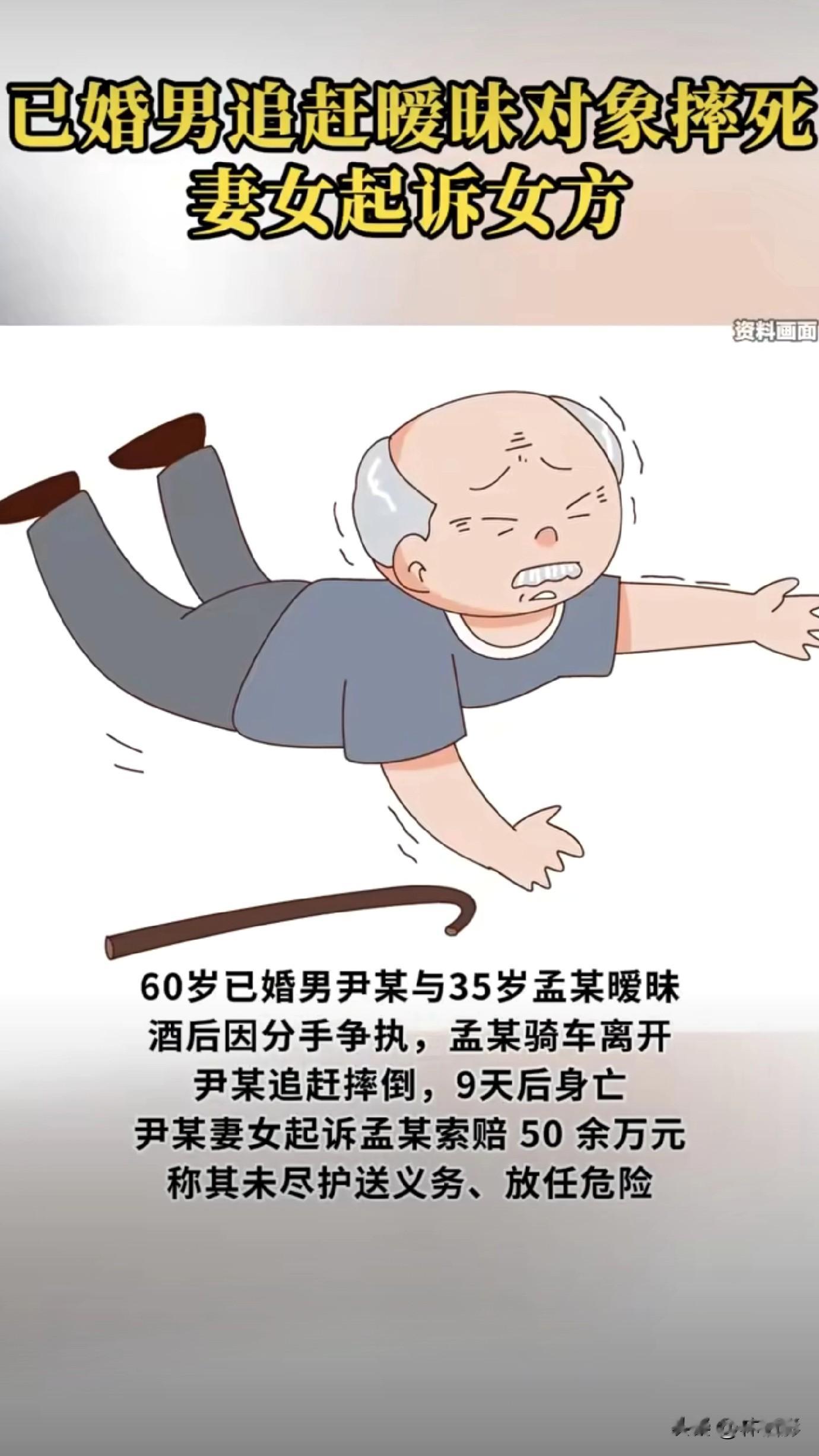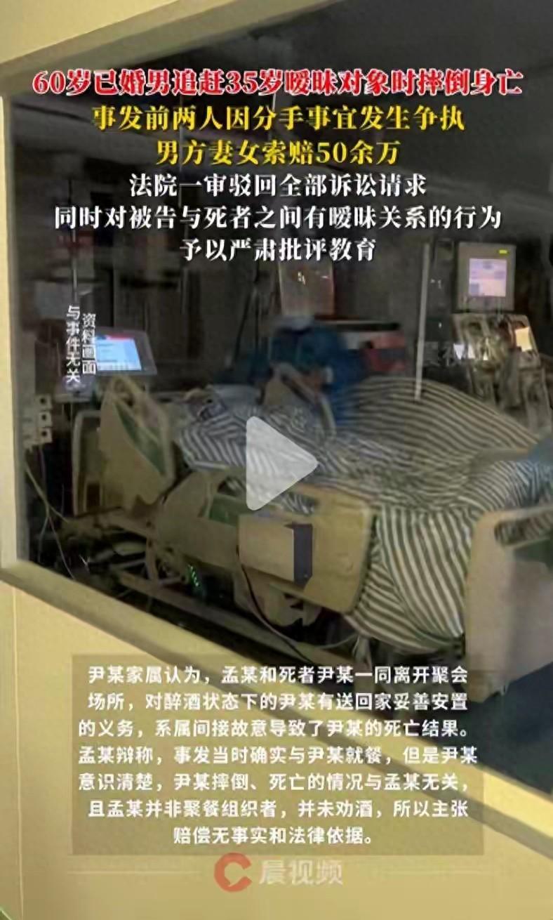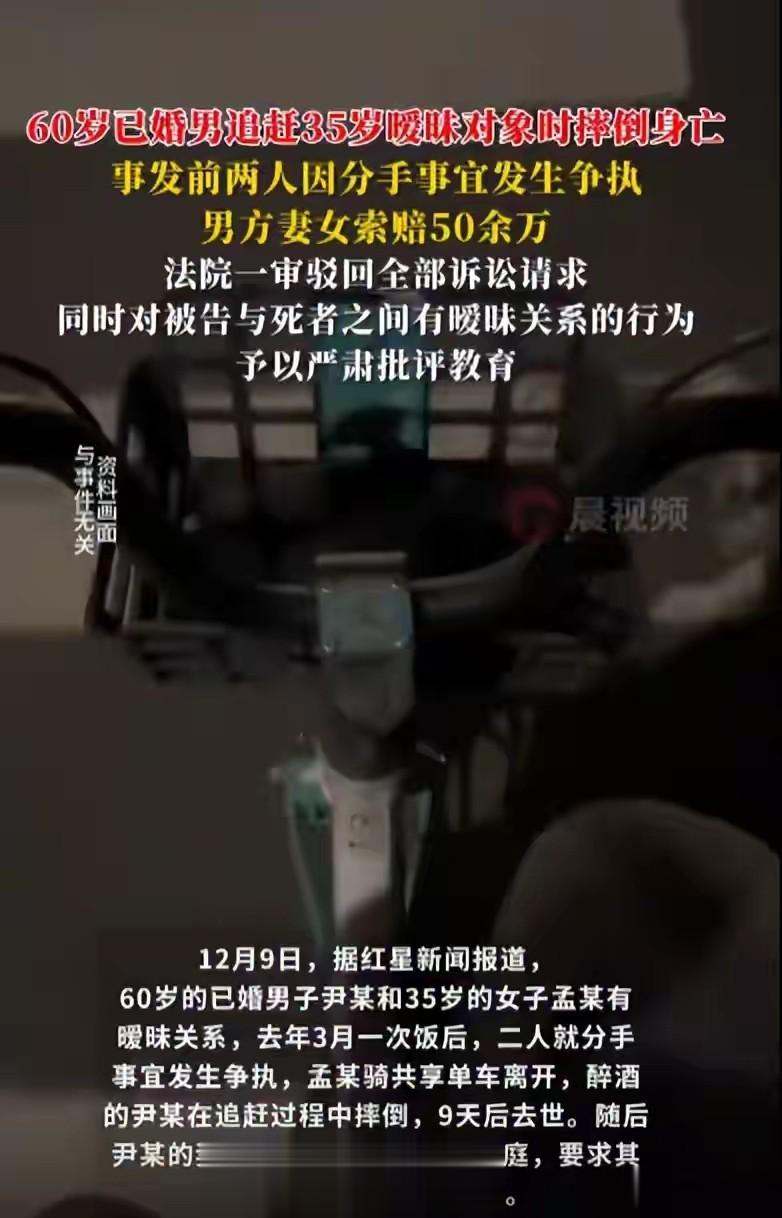 据红星新闻12月9日报道,60岁已婚男子尹某与35岁女子孟某存在不正当关系,去年3月因分手事宜引发争执,尹某醉酒后追赶骑共享单车离开的孟某时意外摔倒,经抢救9天后去世。尹某的妻子和女儿将孟某诉至上海市浦东新区人民法院,索赔医疗费、死亡赔偿金等各类损失共计50余万元,近日法院一审驳回了该项诉讼请求。