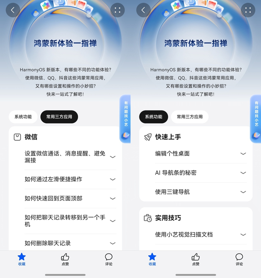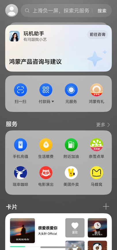 很简单:桌面右滑进入负一屏,点击“鸿蒙产品咨询与建议”,在“玩机助手”对话界面向小艺提问即可。如果没看到这个卡片,别着急划走,点击卡片区域,从下拉卡片列表里就能找到它。