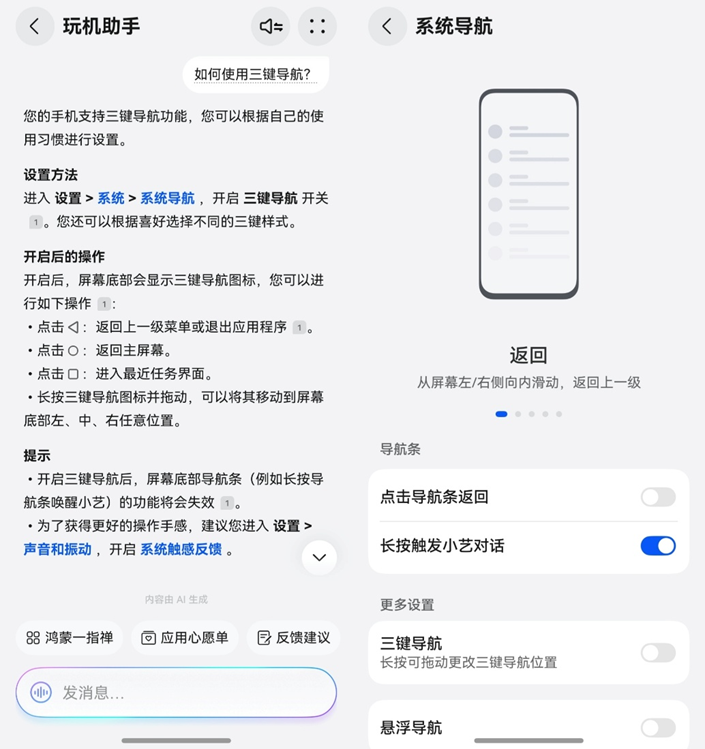 很多朋友用不惯现在的全面屏手势,想把底部的“返回键”找回来,可以问:“如何使用三键导航?”玩机助手不仅会告诉你详细步骤,点击回答里的蓝色关键词,还能直接跳转到设置页面,分分钟搞定!