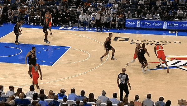 NBA常规赛,雷霆主场迎战勇士的比赛正在进行中。比赛的第二节,杰林-威廉姆斯顺下接球上篮打进2+1,库里第三犯。