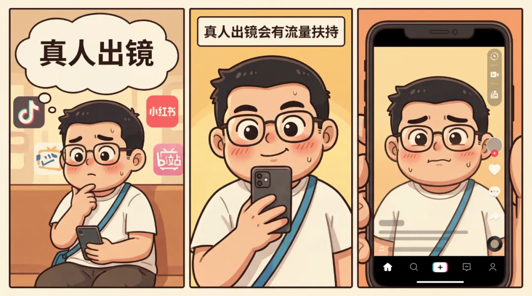 感觉真人出镜会有流量扶持,给用户的感觉也会好一些,虽然人比较挫,还是克服了羞耻心出镜。