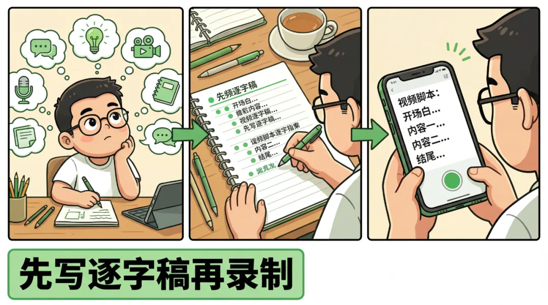 每条视频拍摄之前,我会大概想一下主题,然后用文字的形式写下来,在脑海里过一遍。