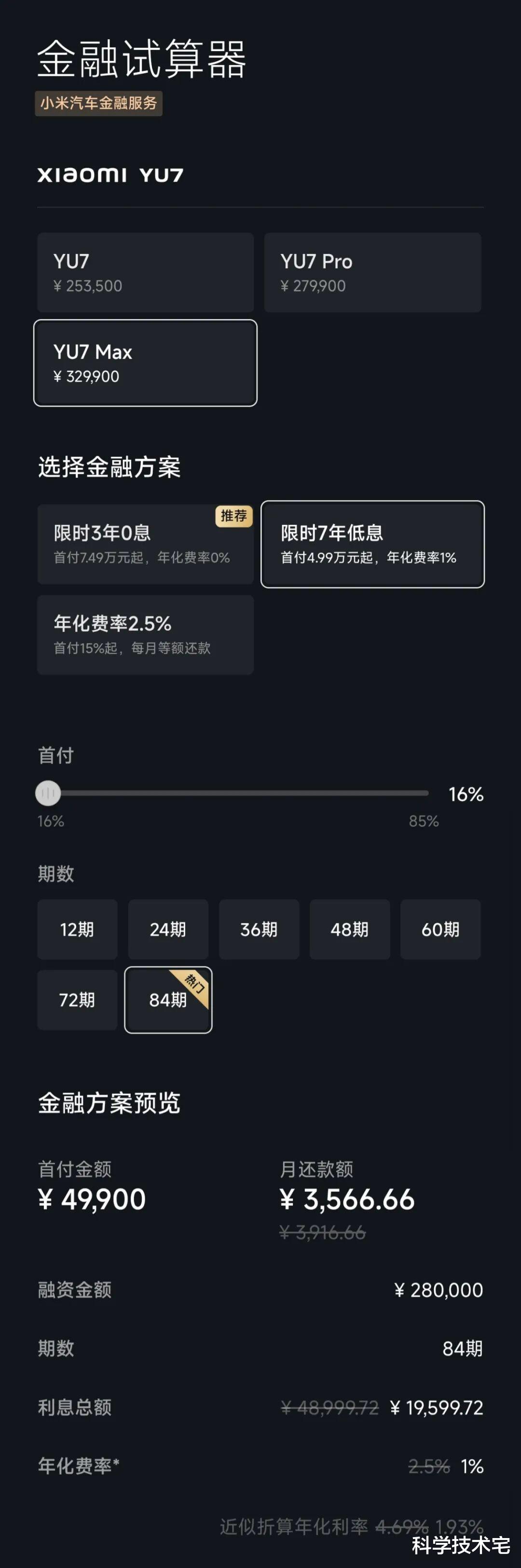 这是在首付4.99万元的情况下,由于车价不同,小米YU7标准版七年的分期利息为一万四千多,小米YU7 Max七年的分期利息为一万九千多,官方宣称年化利率为1.93%,其实并不算很高。