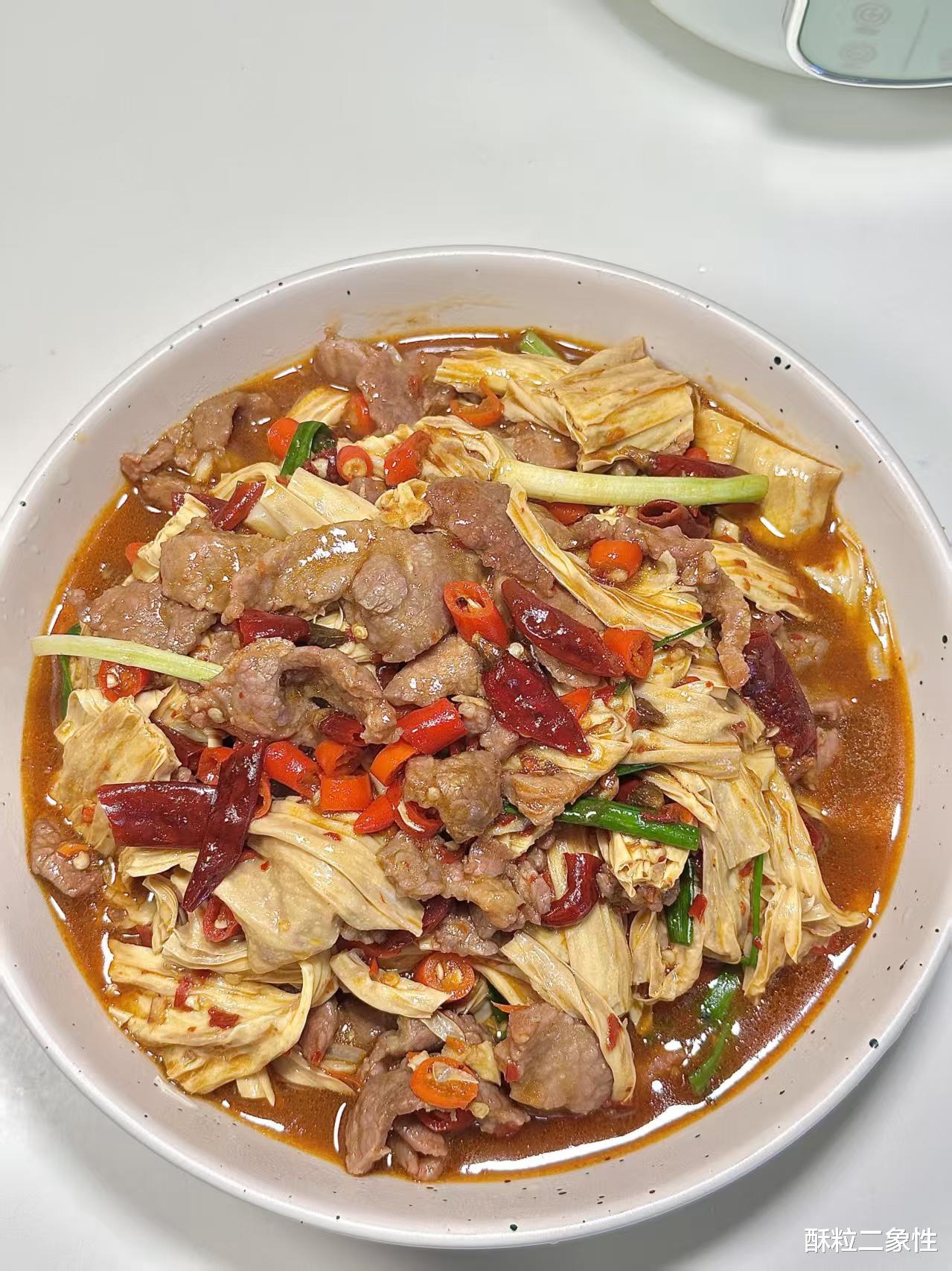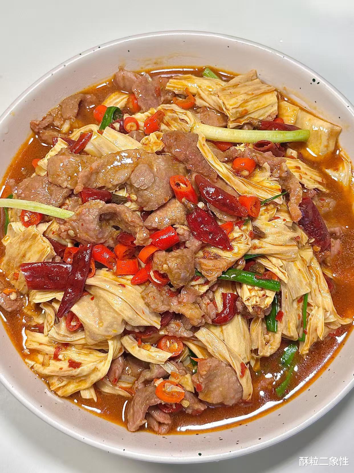 汤汁剩一圈时,水淀粉搅匀再下锅——淀粉会沉淀,不搅就是“小惊喜”疙瘩。大火猛煮,酱汁立刻变稠,像给腐竹穿件贴身毛衣。牛肉回锅,淋葱段、味精,三铲两翻,葱香被热汁一烫,绿得发光,牛肉裹上辣酱,薄腐竹挂满红汁,亮到能照镜子。