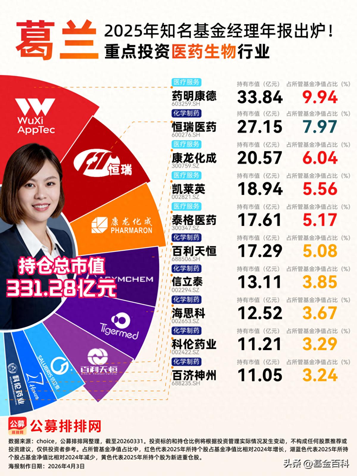 截至2025年末,葛兰持仓总市值达331.28亿元,依旧聚焦医药生物赛道,但在细分领域上有进行结构优化,