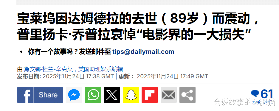 宝莱坞传奇影星达尔门德拉(Dharmendra),于本周一在孟买逝世,享年89岁。当地媒体报道称,他近期因健康问题多次出入医院,具体死因尚未公布,其家人暂未对外发表评论。