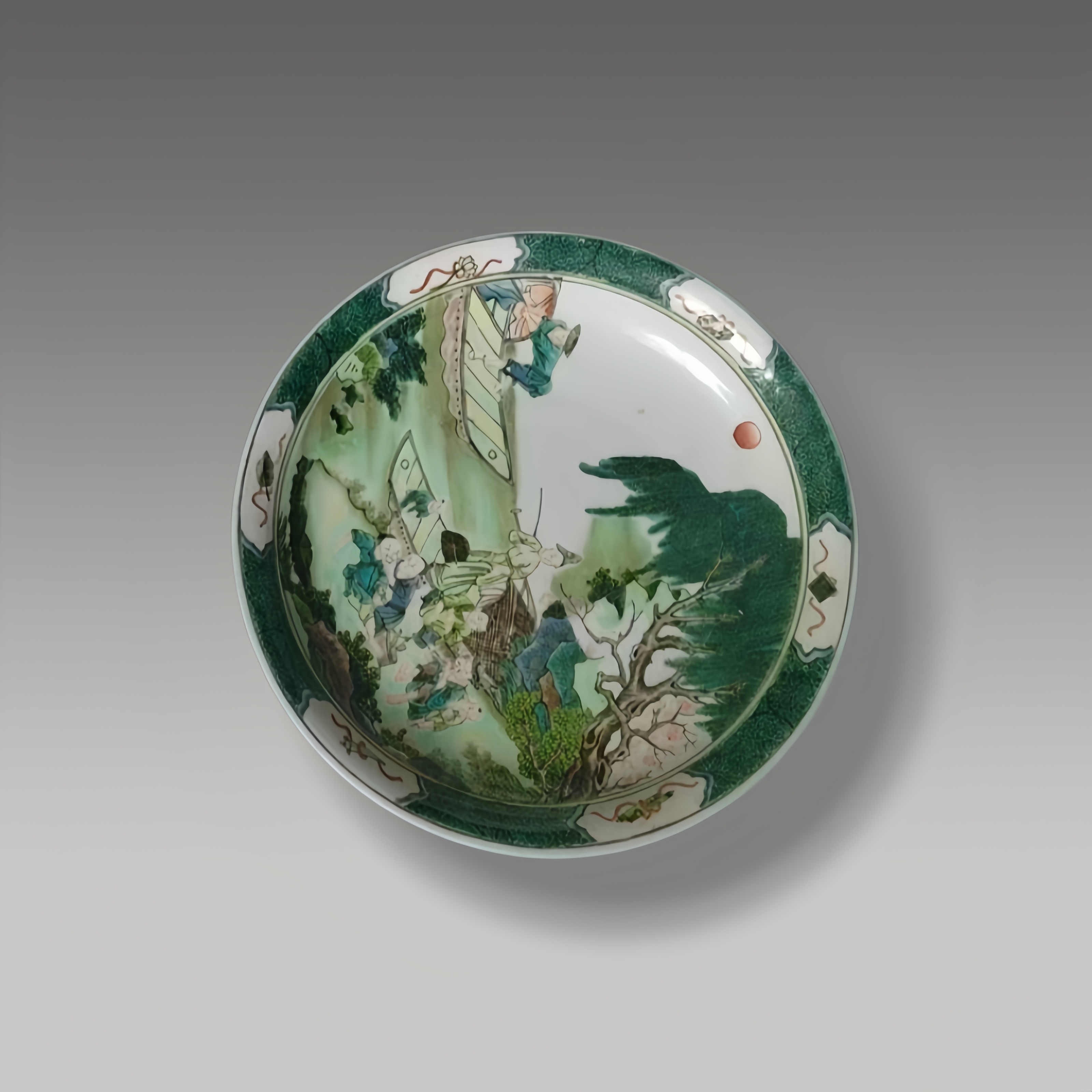 此盘五彩山水人物纹绘工细腻,人物神态鲜活,景致层次分明,盘沿纹饰精巧