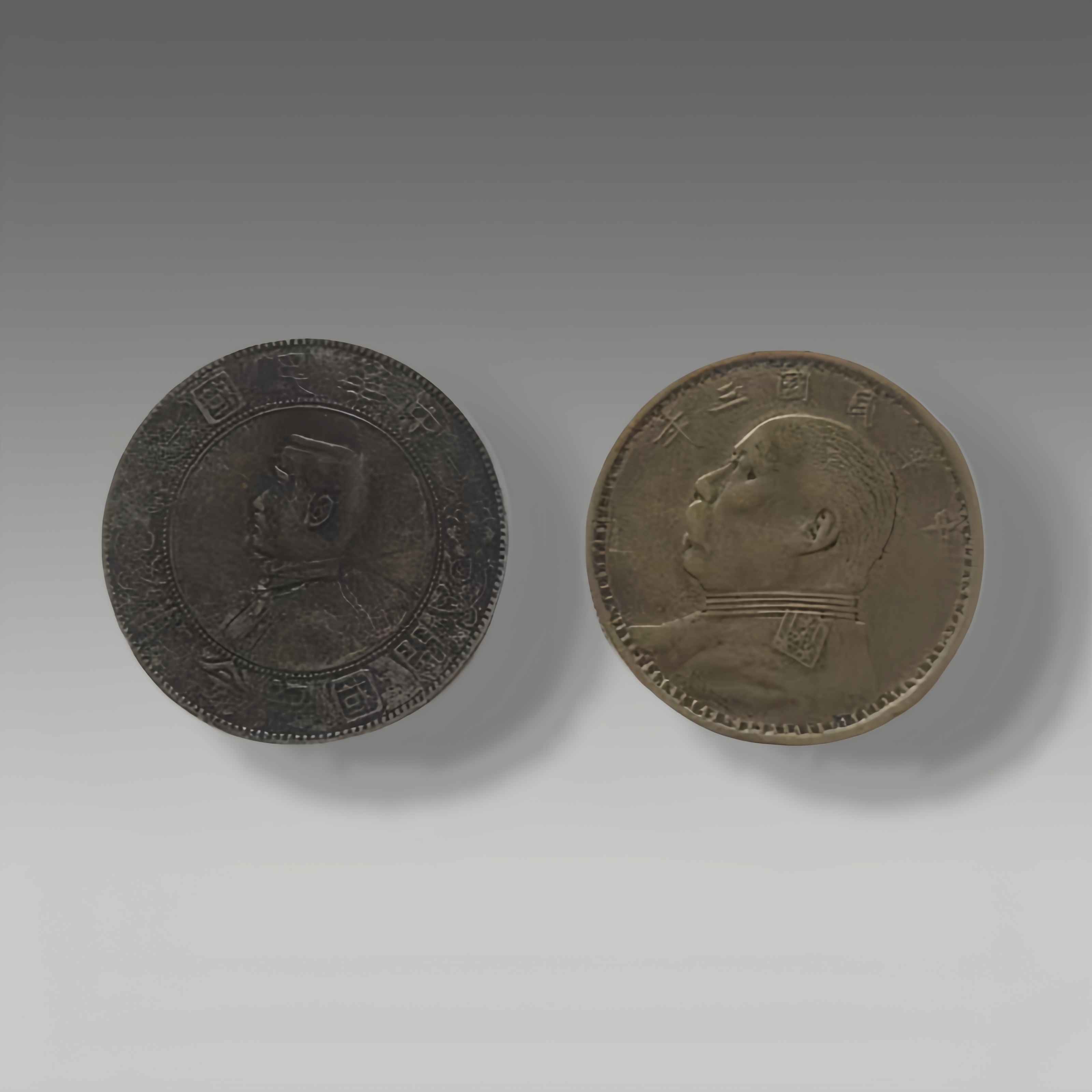 这两枚钱币,正面为人物肖像,背面嘉禾环绕“壹圆”字样,材质与包浆尽显岁月沉淀