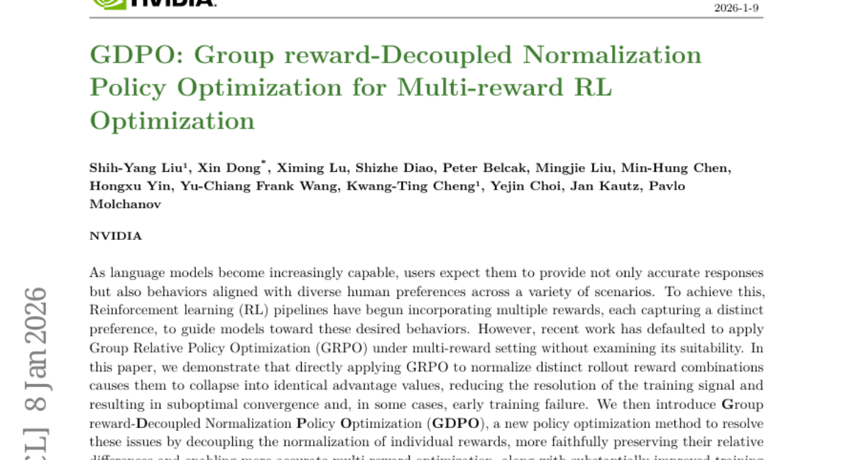 当我们试图教会一个机器人同时学会多项技能时,就像让一个学生同时学习数学、英语和体育一样,往往会遇到"顾此失彼"的问题。英伟达公司的研究团队在2026年1月发表的最新研究中,提出了一种名为GDPO(群组奖励解耦归一化策略优化)的创新方法,有效解决了人工智能在多重目标学习中的核心难题。这项研究发表在arXiv预印本平台,论文编号为arXiv:2601.05242v1,为AI训练领域带来了重要突破。