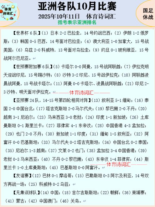 自从6月的中巴之战后,中国男足在9月才开启选帅,10月还在进行面试与考核阶段,因此这两个月的国际比赛期,男足没有安排集训与热身。而亚洲其余球队则纷纷集结备战,24队在10月征战亚洲杯预选赛(国足直接晋级正赛),6队在参加世预赛附加赛(国足无缘本阶段),已经晋级世界杯的6队则在与强队热身,而没有亚预赛、世预赛、世界杯任务的球队也在积极热身,包括国足、朝鲜在内,亚洲球队在10月一共只有7队没有比赛。汇总各队10月比赛结果,括号里表示亚洲排名。