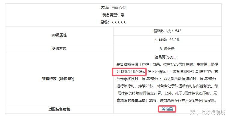 其次,就是希格雯的武器太过于专一了,扶持条加的是生命值,装备特效更是完全堆生命的存在,别的专武还可以过渡给别的角色用,但希格雯不行,唯一的亮点就是人家可以后台提升,处于3层疗护状态下时,元素爆发的暴击率提升28%,但这里的关键在于,这个专武只适用于希格雯,其他角色用了也没多大提升,目前这个专武,弓箭角色里面基本没有能用得上的角色。