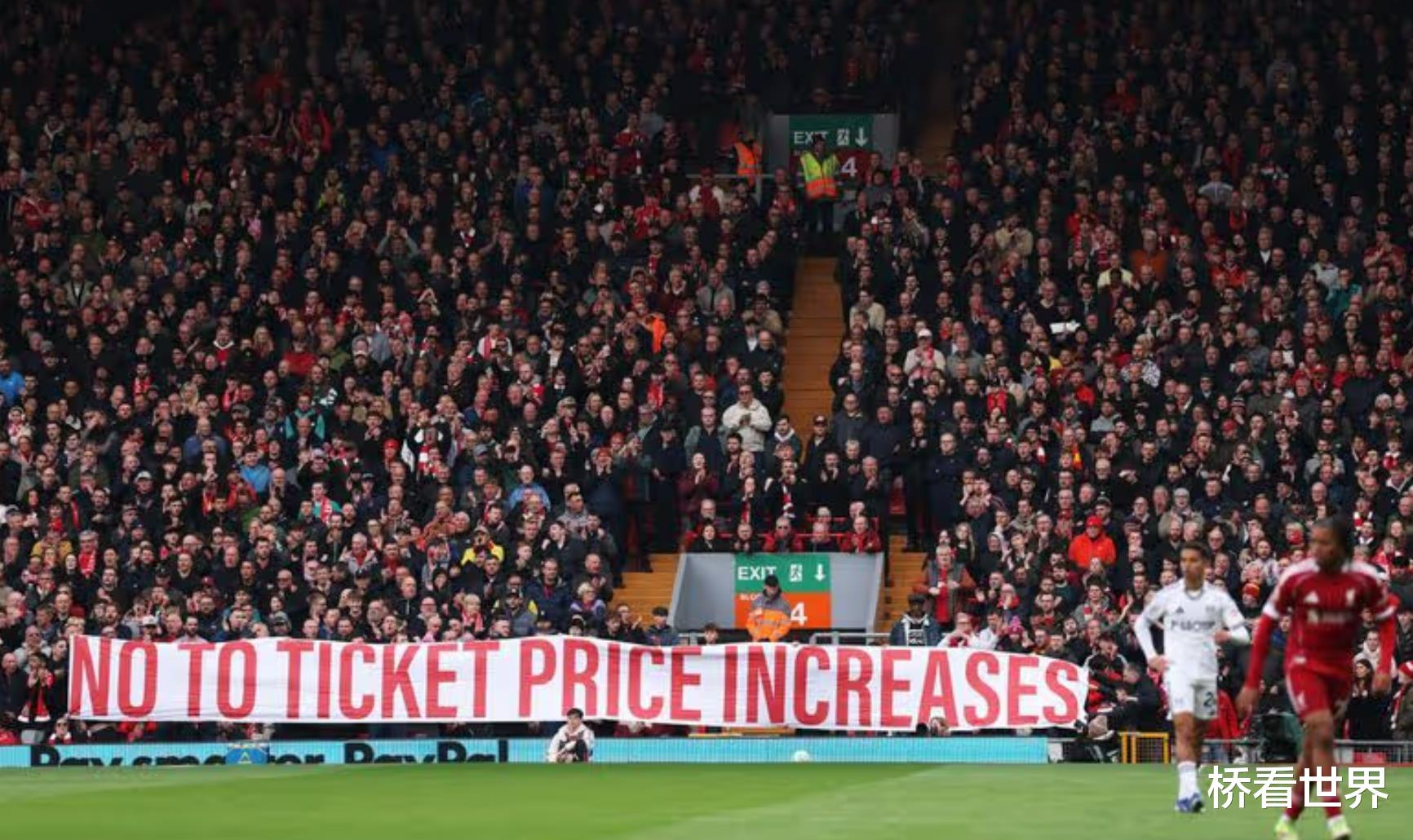 除了看台上的无声抗议,利物浦球迷们还在比赛中打出巨型横幅,清晰写着:“反对球票涨价”。