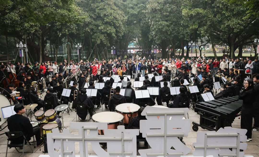 1月11日,重庆南开中学主席像前的露天小广场乐声悠扬,学校管乐团、弦乐团联袂献上新年首场校园音乐会,以灵动旋律开启新一年的校园篇章,全校师生共享这场沉浸式艺术盛宴。
