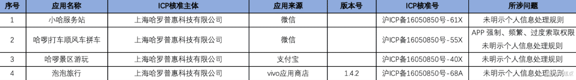 被通报的4款APP包括:“小哈服务站”存在未明示个人信息处理规则问题;“哈啰 | 打车顺风车拼车”存在APP强制、频繁、过度索取权限及未明示个人信息处理规则问题;“哈啰景区游玩”存在未明示个人信息处理规则问题;“泡泡旅行”同样存在未明示个人信息处理规则问题。