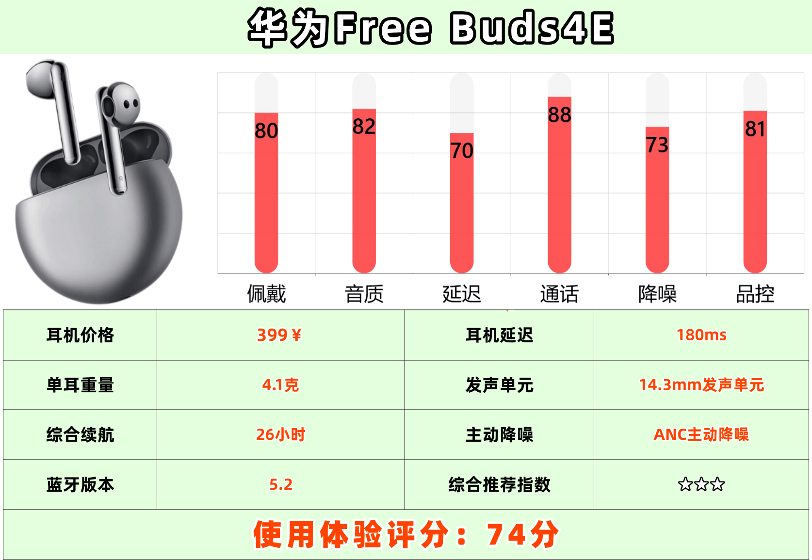 内置 14.3mm 宽音域发声单元,低频饱满有力,氛围感浓厚,适合流行和电子乐爱好者,高频解析稍弱,细节还原略逊,支持蓝牙 5.2 与双设备连接,开盖即弹窗配对,连接便捷,耳机单次续航约 4 小时,配合充电盒总续航达 26 小时,满足日常使用需求,延迟约 180ms,日常影音体验尚可,但不太适合对同步性要求较高的手游场景。