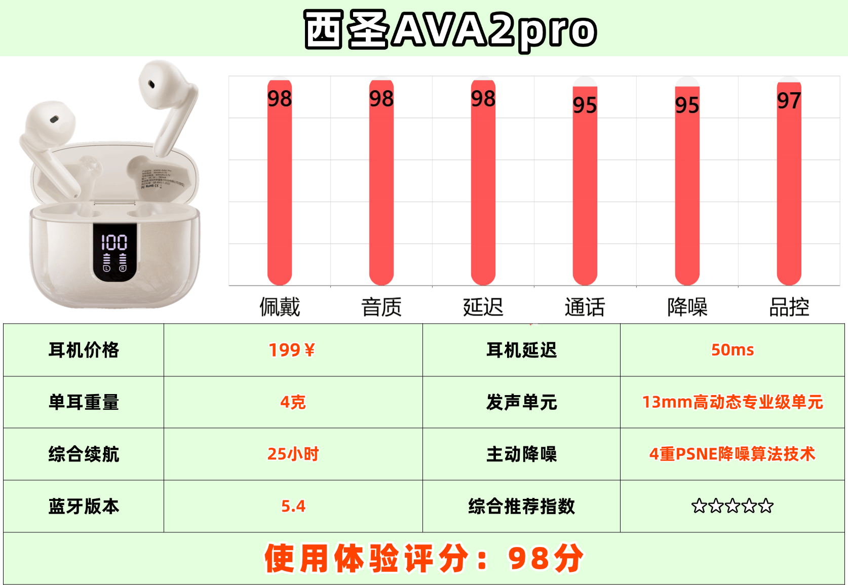 西圣AVA2Pro在佩戴舒适度上的表现无与伦比,通过深入分析超过20000组国人耳廓数据,西圣创新性地实现了第四代半入耳体感科技,配合重量仅4克的超轻设计“无物佩戴”的极致舒适体验,AVA2还采用了Buoyancy人体工学设计,充分考虑了国人耳型的独特需求,同时兼顾不同用户的个性化佩戴习惯,凭借这一领先的技术与设计,西圣AVA2Pro获得了众多专业测评师的高度评价,标志着其已经达到了行业顶尖水平,完全媲美千元级舒适度!