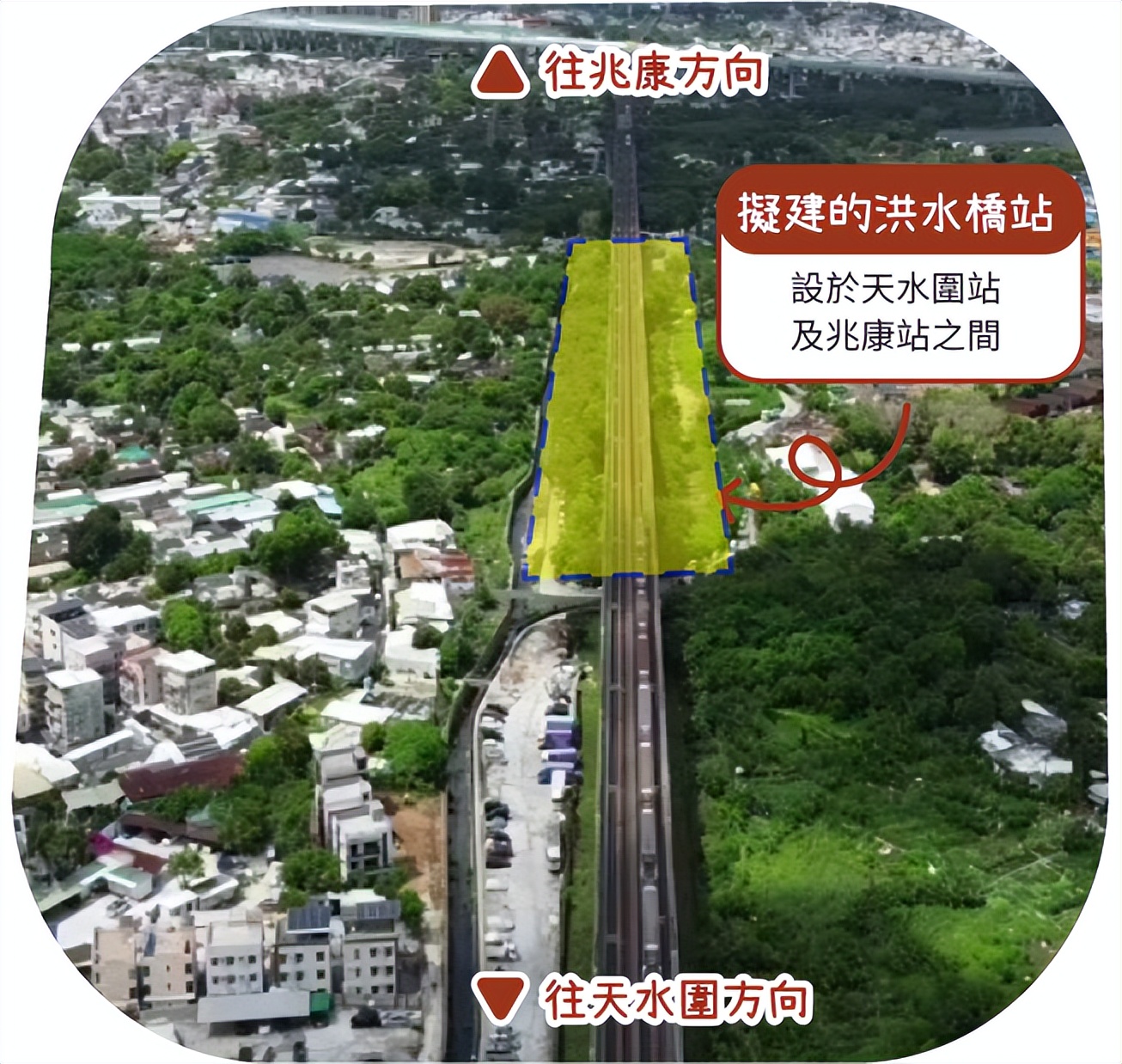 洪水桥站位于屯马线天水围站及兆康站之间,是全港第一个在营运中铁路高架桥上加建的车站。