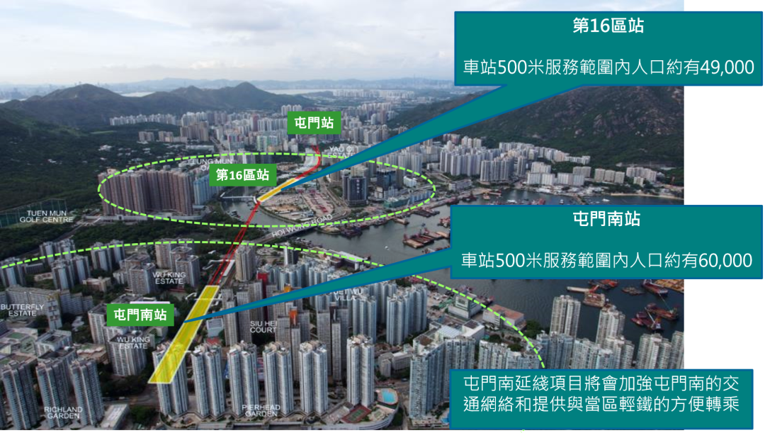 屯门南延线屯门南延线将现有屯门站的铁路向南延伸约2.4公里,当中会增设第16区中途站,新终点站为屯门南站。