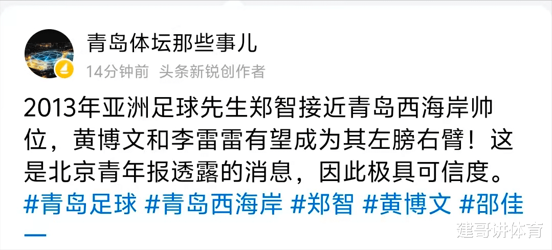 北京时间11月28日,在青岛西海岸主教练邵佳一带着他的助教团队执教中国男足后,谁来接替邵佳一担任青岛西海岸的主教练,也成为了青岛球迷关注的焦点,根据青岛官方媒体记者“青岛体坛那些事”的爆料,他称2013年亚洲足球先生郑智接近青岛西海岸帅位,和他一起前往青岛西海岸的还会有黄博文和李雷雷。