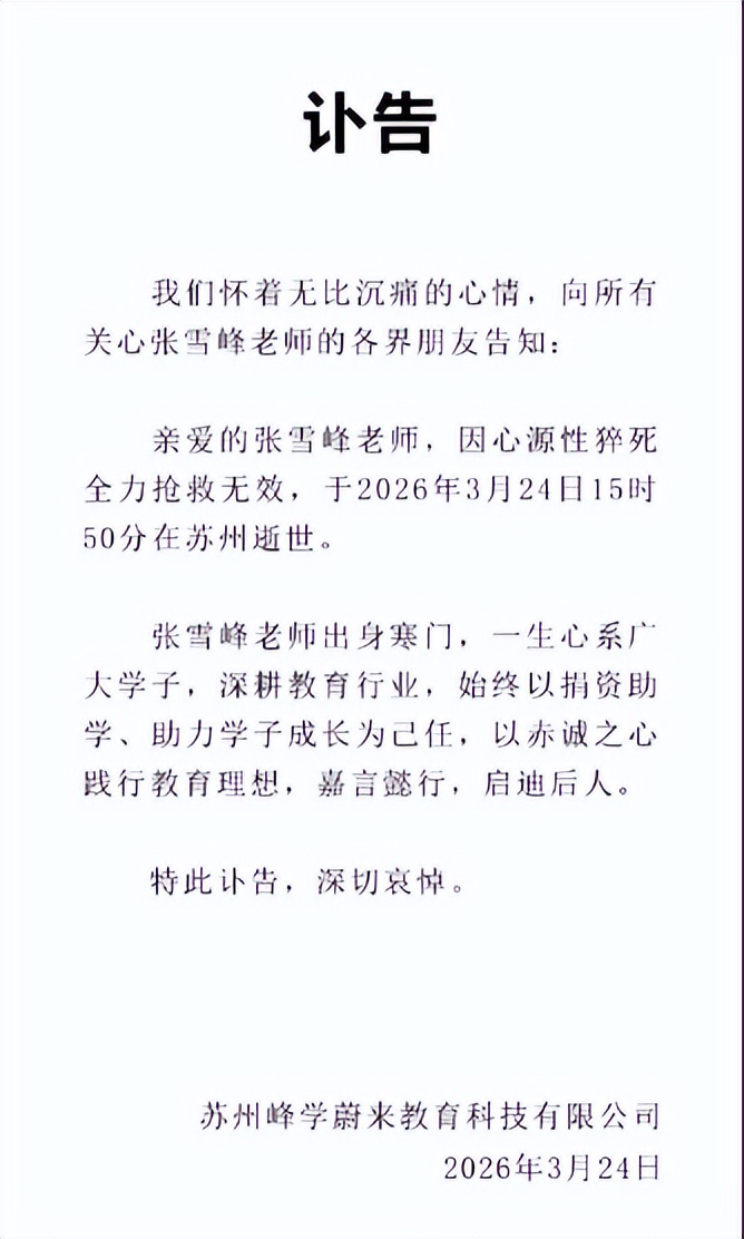 3月24日15时50分,苏州峰学蔚来教育科技有限公司发布讣告,张雪峰因心源性猝死,经全力抢救无效离世,年仅41岁。