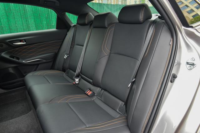 接下来重点说空间,这也是亚洲龙的一大优势。轴距2870mm的数据在B级车里本就很突出,实际体验更是超出预期。我身高1.8米,坐在后排的时候,腿部空间大概有两拳余量,头部空间也有近一拳,完全不会觉得局促。后排横向宽度达到1480毫米,就算坐三名成年人,中间的乘客也不会觉得挤,中间地台的隆起也不高,整体乘坐体验很舒适。更贴心的是它的后车门设计,行政级轿车的开门角度,比普通轿车大很多,上下车的时候不用小心翼翼侧身,尤其是老人和孩子,上下车特别方便。