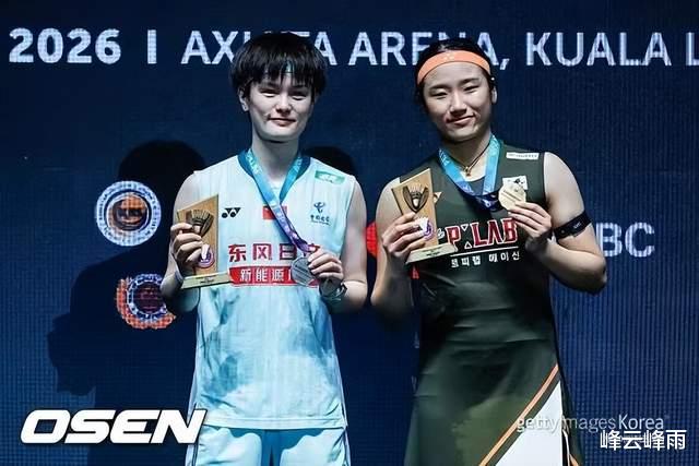 安洗莹(右)在2026年马来西亚公开赛女单决赛以21:15、24:22击败中国女将王祉怡