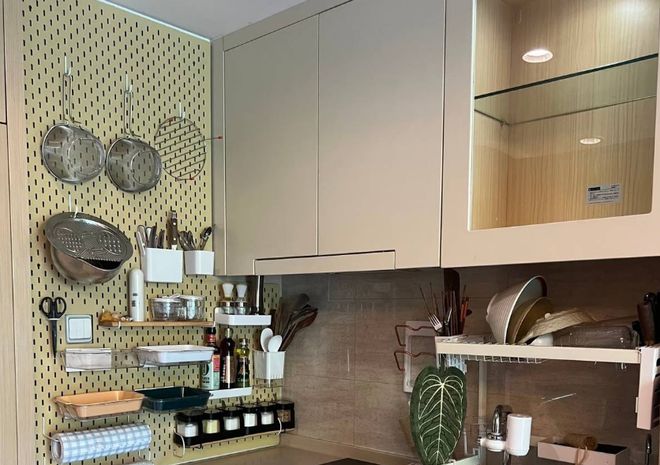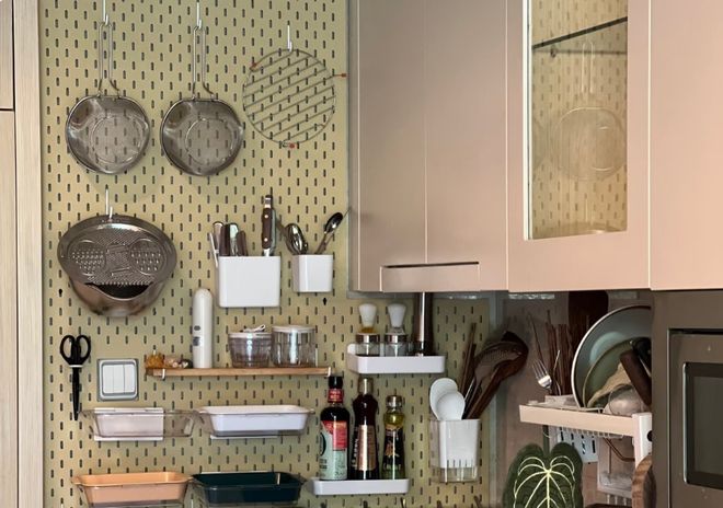 做法就是在厨房墙面安装一整面高强度的洞洞板,金属或者是实木材质,而不仅有挂钩,而且上面设计多功能的配件。