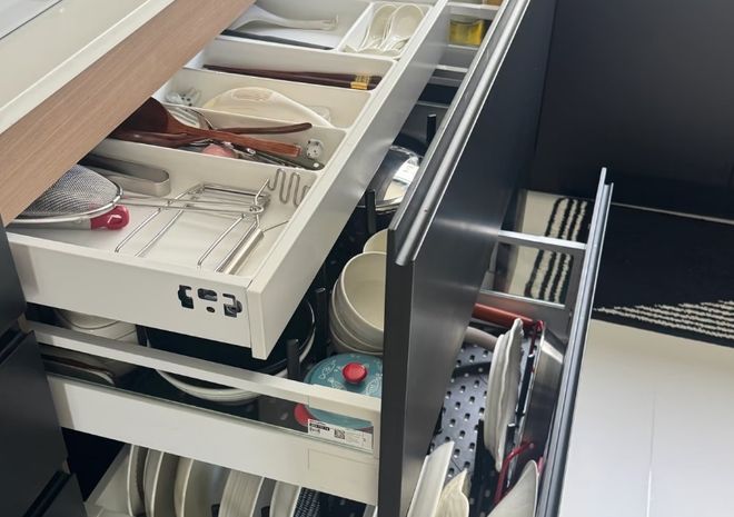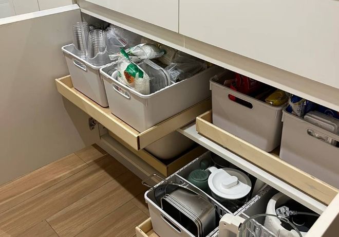 做法就是将地柜大部分改成抽屉,抽屉内部按照各种物品分类进行收纳。