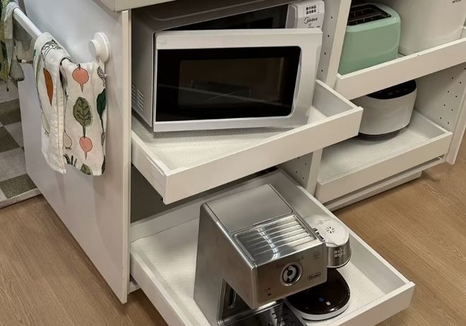 第四种在年轻人中非常流行的脑洞厨房家电收纳设计,就是抽屉式收纳。