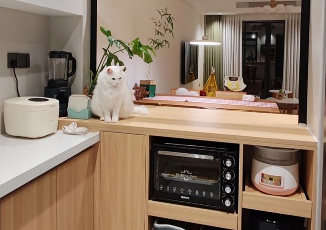 而每一层的高度不一,具体是按照小家电的尺寸来划分。例如下层35厘米放咖啡机、吐司机,45厘米高放空气炸锅、电饭煲,上层放破壁机。