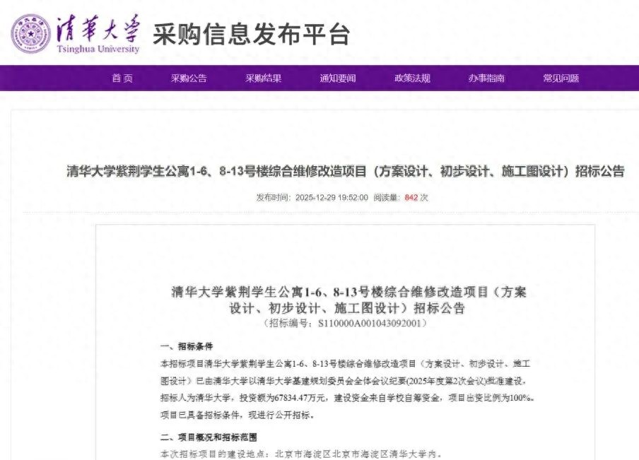 清华大学《清华大学紫荆学生公寓1-6、8-13号楼综合维修改造项目(方案设计、初步设计、施工图设计)招标公告》(图源:清华大学采购信息发布平台)