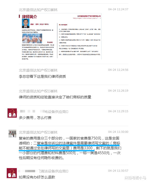 ·收费不透明:商标驳回复审报价4550元/类,其中“律师文案费”高达3300元,远高于市场合理水平,且拒绝提供明确退款机制。