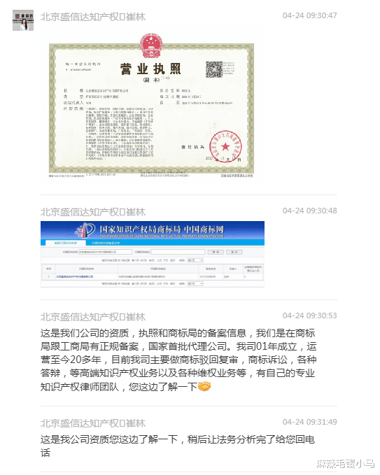 ·机构名称混乱:聊天中先后使用“北京盛信达知识产权崔林”“北京盛信达知识产权仲裁中心”等不同名称,涉嫌虚构主体。