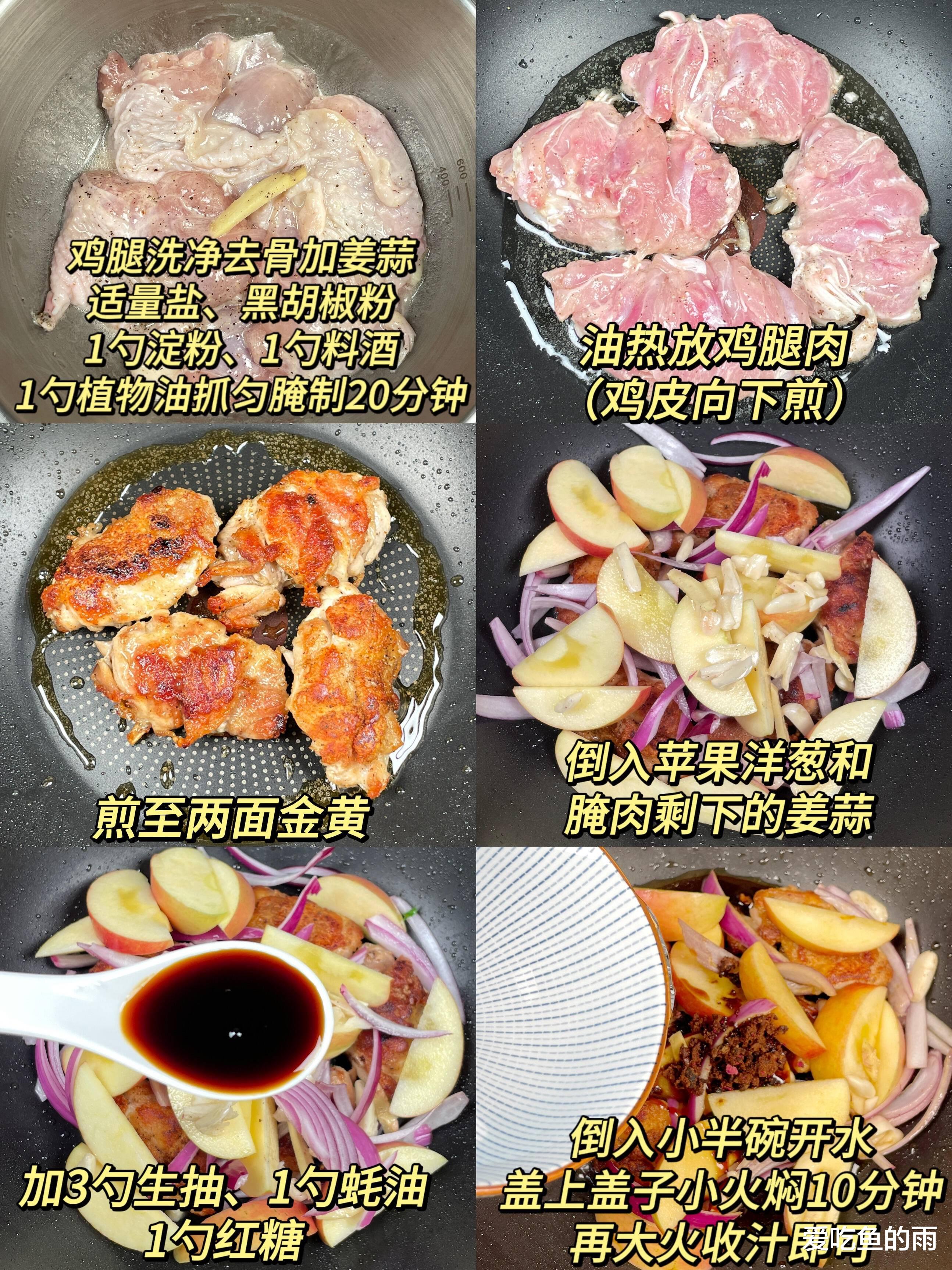 做这道菜,选材是个技术活。鸡排得选带皮的鸡腿肉,去骨后用刀背拍松,这样煎的时候不缩水,口感还嫩得像豆腐;苹果不能用面苹果,得挑那种脆硬酸甜的红富士或者青苹果,切成滚刀块后泡在淡盐水里,不然下锅一炒就氧化成黑炭,颜值全毁。我有次偷懒没泡水,结果一锅红亮的酱汁里混着黑乎乎的苹果块,像煮了一锅煤球,被我妈笑话了好久。做法其实不难,鸡排先用生抽、黑胡椒和料酒抓匀腌制,下油锅煎到两面金黄焦脆,盛出来备用。锅里留底油,放冰糖炒出糖色,倒入鸡排翻炒上色,这时候加入半碗苹果汁代替清水,再丢进苹果块,中小火焖煮收汁。重点来了!苹果不能煮太烂,得保持一点脆度,等到汤汁浓稠得能挂在铲子上,撒点盐调味出锅,那股混合着焦糖香和果香的热气,能把隔壁小孩馋哭。