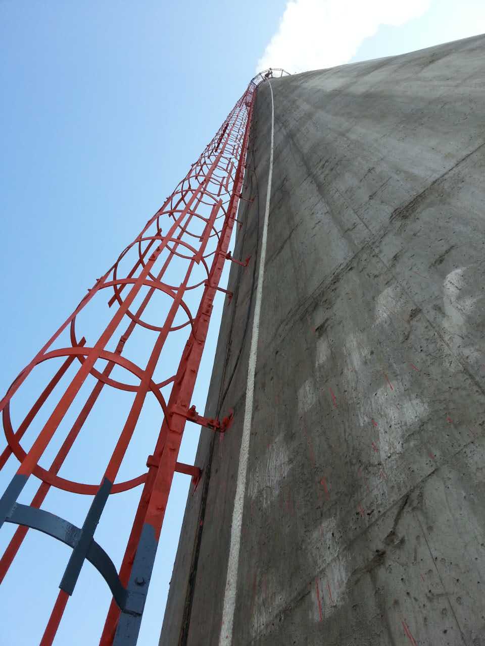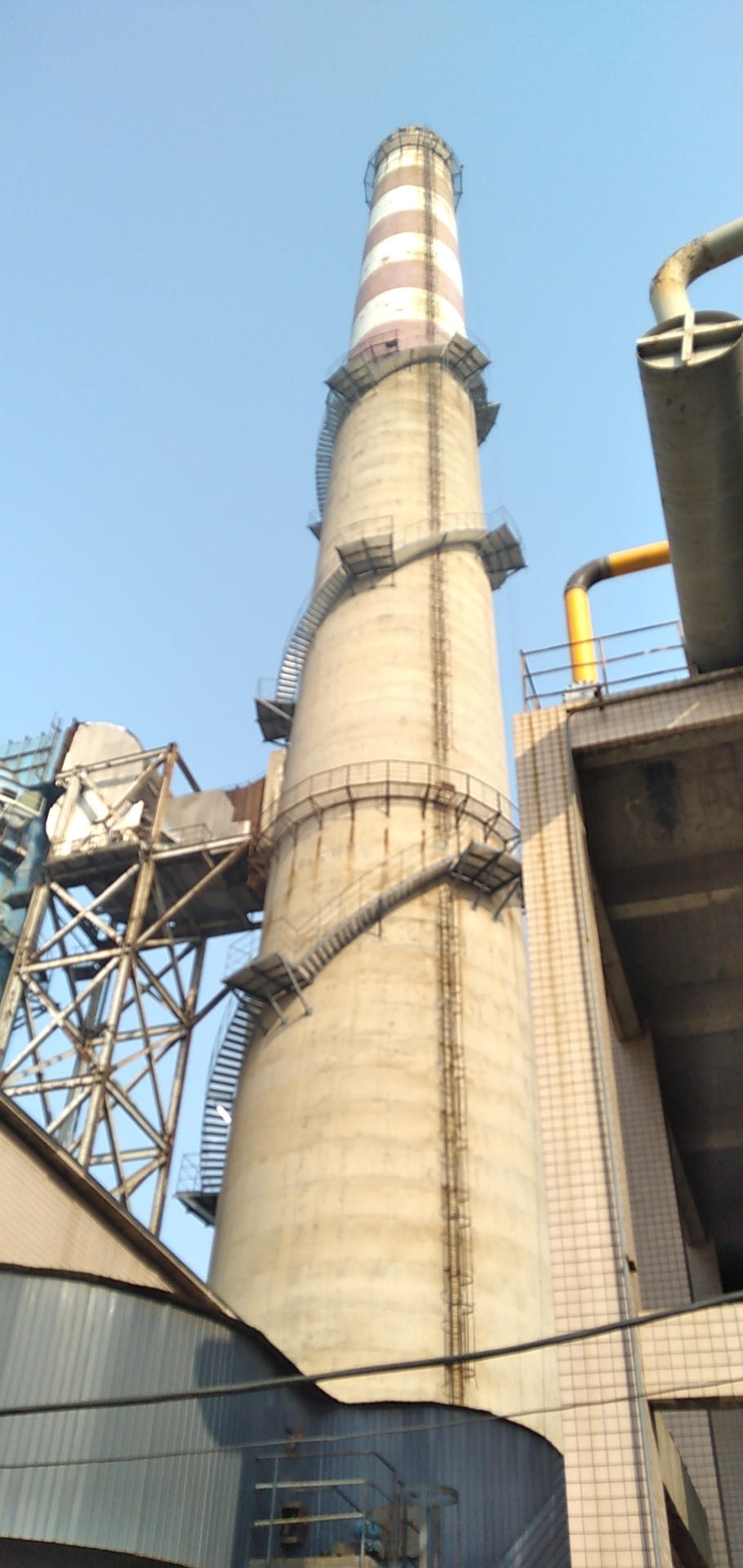 安装平台护栏与踢脚板,护栏立柱与平台主梁满焊连接,横杆间距≤600mm,踢脚板高度≥150mm;在平台与烟囱爬梯对应位置,设置接驳口并安装安全门,确保通行安全。 对所有焊接部位、钢材运输过程中损坏的镀锌层,进行打磨除锈,补涂环氧富锌底漆 + 聚氨酯面漆,干膜总厚度≥200μm;确保防腐涂层均匀,无漏涂、流挂现象。