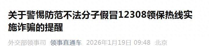 近期,外交部全球领事保护与服务应急热线(12308领保热线)和部分中国驻外使领馆接到反映,有不法分子通过技术手段冒用12308领保热线号码致电,以个人资料泄露、涉嫌散布非法信息、涉嫌违法犯罪等为由,诱骗接电人提供个人信息、“接受调查”、缴纳“保释金”等实施诈骗。
