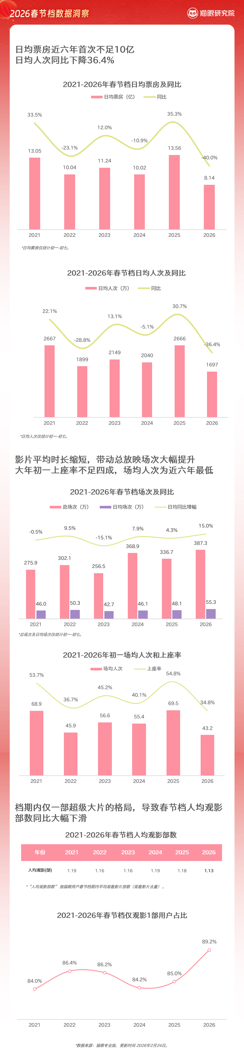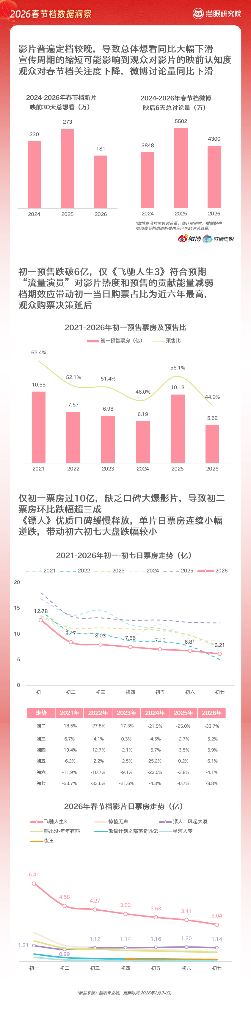 2026年2月24日,猫眼研究院发布《2026春节档数据洞察》(以下简称《洞察》)。《洞察》显示,今年春节档电影总票房达到57.52亿元,总观影人次1.2亿。由于缺乏强流量高热度的爆款大片的带动,档期内整体表现平平,仅《飞驰人生3》票房表现符合行业预期。《镖人:风气大漠》上映后凭借过硬口碑实现票房逆跌,带动假期最后两日大盘跌幅相对较小。