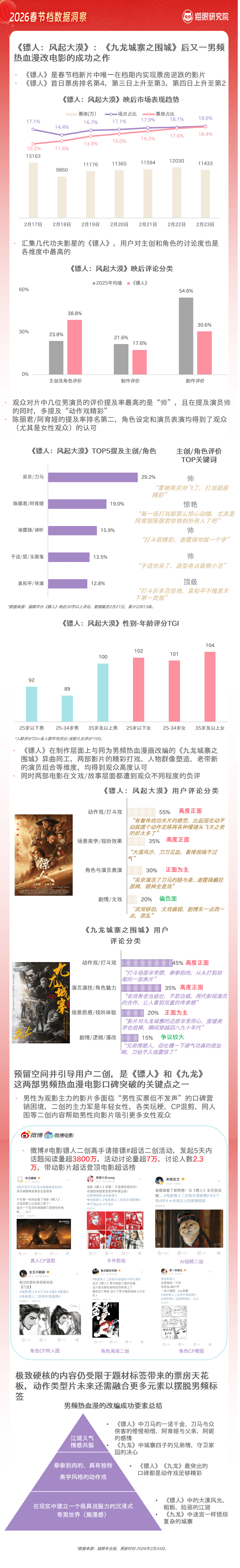 除头部影片领跑外,档期中亦涌现口碑黑马。武侠片《镖人:风起大漠》成为今年春节档唯一实现票房逆跌的影片。《洞察》显示,影片首日票房排名仅第4,到第四日已成功升至第2,场次占比与票房占比同步走高。作为男频热血漫改作品,《镖人:风起大漠》集齐几代功夫影星,精彩的动作戏成核心亮点,观众对主创及角色的评价占比达38.8%,远超2025年均值。值得一提的是,陈丽君饰演的阿育娅获得女性观众的高度好评,观众提及率仅次于吴京饰演的主角刀马,让影片在核心男性受众之外,实现了受众圈层的突破。