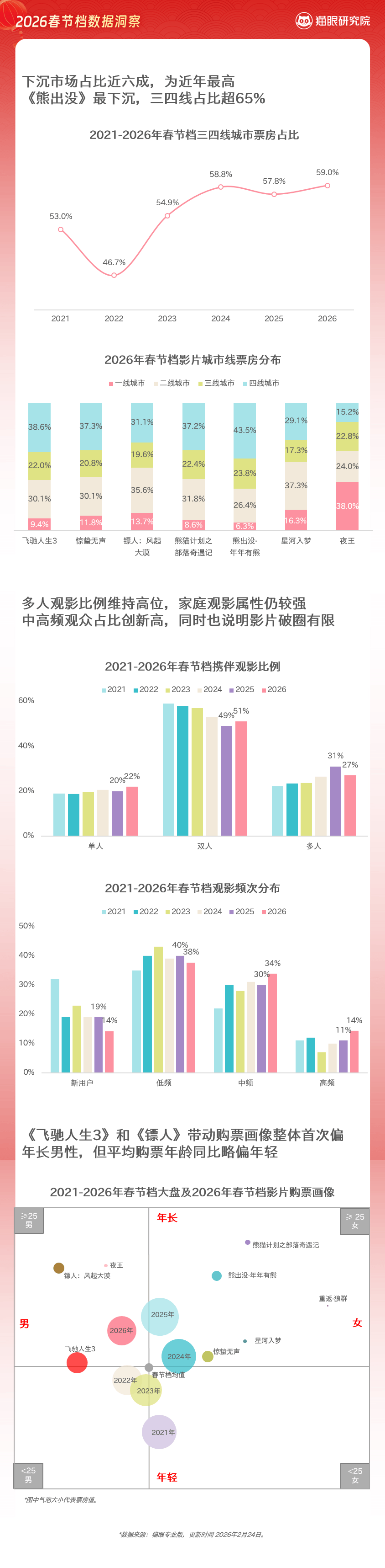 随着各地观众返乡过年,下沉市场成为春节档票房的主力军。今年春节档,三四线城市票房占比接近六成,为近六年最高,下沉市场消费潜力得到进一步释放。具体到影片,除《星河入梦》《夜王》外,其余新片三四线城市票房占比均超过50%,其中《熊出没·年年有熊》占比更是高达65%以上。而在全国影城票房排名中,有4家四线城市影城跻身前十。