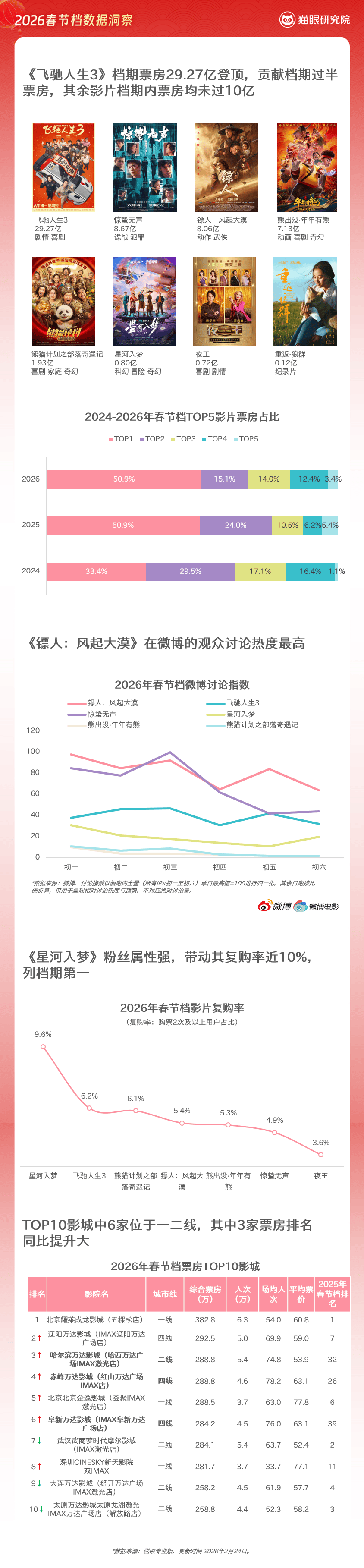 猫眼娱乐市场分析师赖力表示,2026年春节档整体表现喜忧参半。一方面,头部IP的持续发力与优质作品的口碑逆袭并存,下沉市场的消费潜力进一步释放,展现出中国电影市场的坚实基础和超强韧性。另一方面,“冰火两重天”的最终格局,以及档期票房表现也给所有人带来了警示,行业也需要对春节档的生态、不同影片的抗压能力,以及“定档晚”“过度依赖流量”等现象重新评估审视。希望未来电影市场能够进一步优化提升内容供给、探索多元类型题材、持续挖掘消费潜力,助力行业朝着更高效、更繁荣、更具活力的态势不断发展。