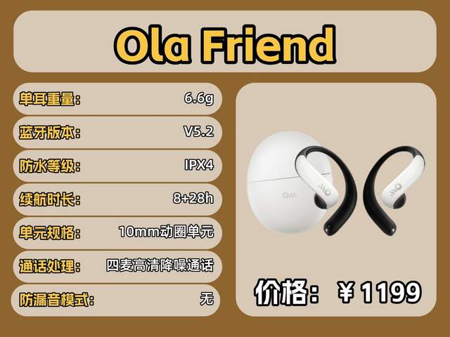 Ola Friend这款耳机有四麦高清降噪通话,确保在不同场景中保持清晰的人声,提高在通话中的使用体验;8+20小时续航满足日常使用需求;蓝牙V5.4提供稳定高效的连接。整体使用体验感非常优秀。