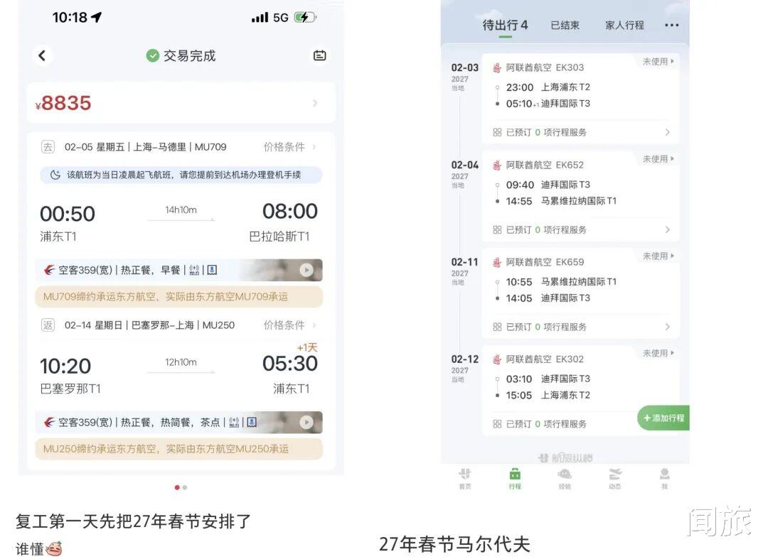有网友花费4879元锁定了2027年春节北京到西班牙机票;有人提前下手北京-斯里兰卡往返机票;有人花5400拿下2027年春节西葡往返机票。