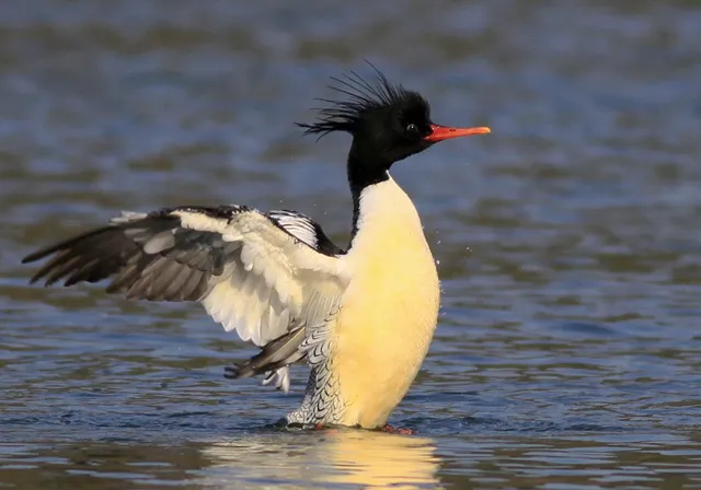 它的特别之处,可不只是会上树这一个绝活。你见过顶着“杀马特”发型的鸭子吗?中华秋沙鸭的头顶长着一对张扬的双冠羽,活脱脱就是一位来自远古的“潮鸭”。它那红色的嘴喙和腿脚,配上身上独特的鱼鳞状斑纹,让人第一眼都不敢认这是只鸭子。