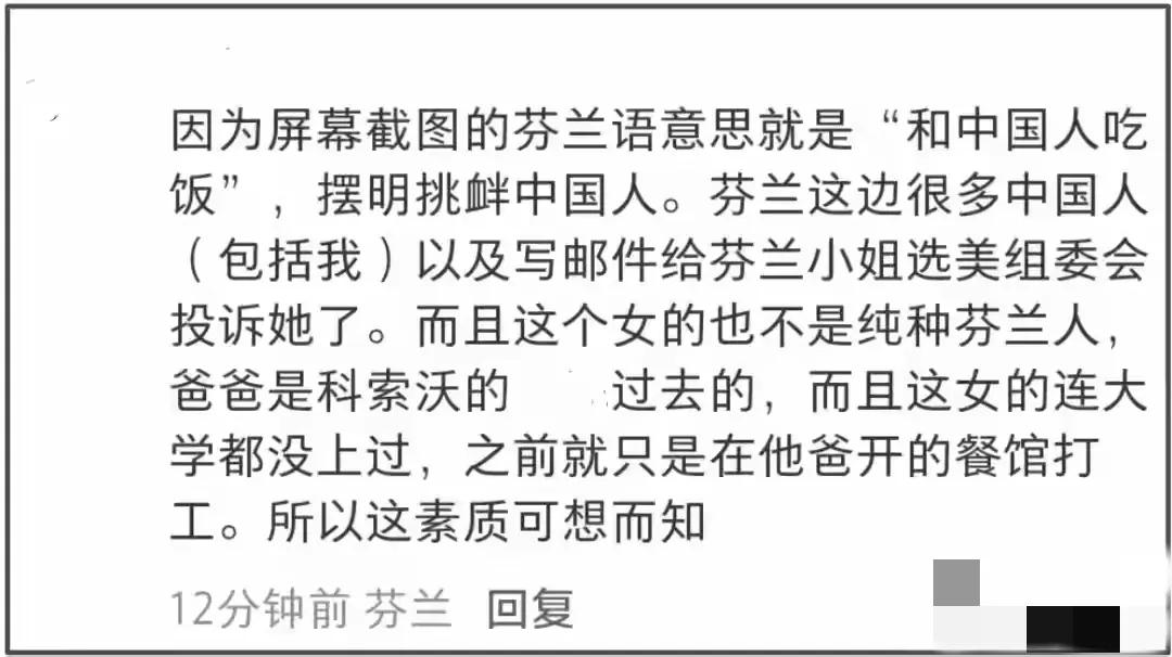12月11日传出消息,此前公开通过拉眼角,以及“和中国人吃饭”言辞,在网上涉嫌歧视华人的芬兰小姐冠军莎拉,被一撸到底成为素人!