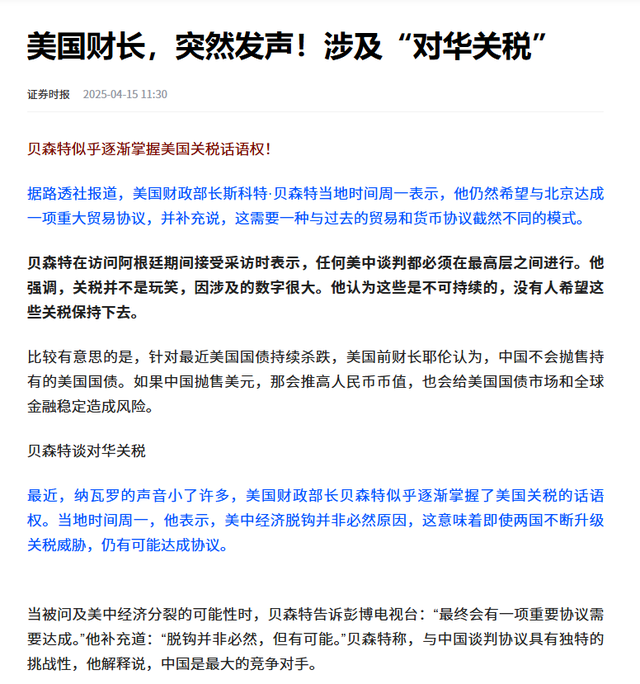 美国财长,突然发声!涉及“对华关税”.证券时报.2025-04-15
