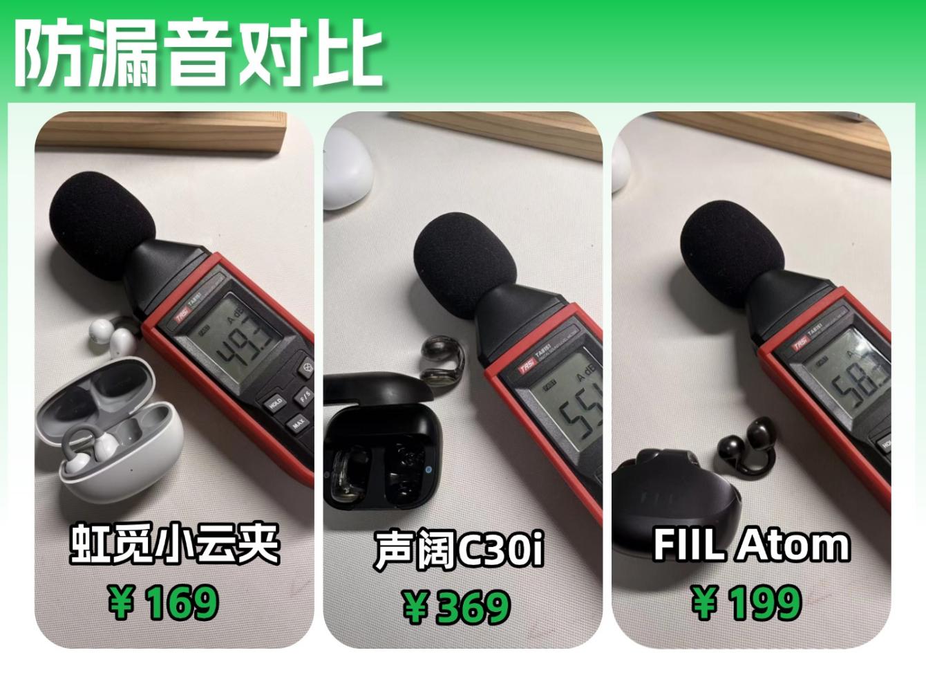 防漏音方面,虹觅 Air2 小云夹做得最好。它有自研的防漏音模式,按三次按键就能开启,通过反向声波抵消漏出的声音。我测试的时候把音量开到一半,旁边的人几乎听不到声音,就算在安静的办公室用,也不用担心打扰别人。FIIL Atom 和声阔C30i虽然也有基础的防漏音处理,但效果不如虹觅,在安静环境下,旁边的人可能会隐约听到一点声音,不过音量调小些就好多了。