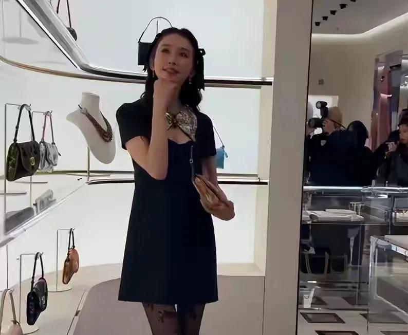 第一套服装是黑色低胸短裙,颈部位置还戴了一个彩色的蝴蝶结,头发两侧还各有一个黑色蝴蝶结发卡,就像一个萌系的小网红。
